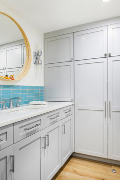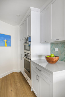 In the heart of the condo, the kitchen took on a classic yet contemporary look with white cabinets. White kitchens are timeless and versatile, providing the perfect canvas for other design elements to shine. With the removal of the dividing wall, the kitchen now offered not only functionality but also stunning views of the bay. We selected celadon, tan, and ocean blue zellige tiles for the backsplash. Originally from Morocco, these handcrafted tiles are known for their organic movement and unique glaze. These tiles served as a visual representation of the serene bay views outside, connecting the interior with the natural world beyond.