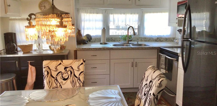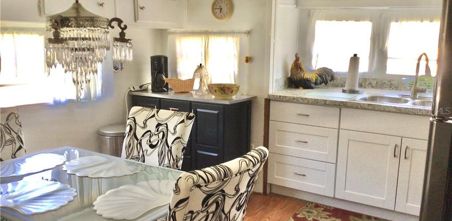 BACK ON THE MARKET. Fixer upper in active 55+ community. One bedroom, one bath mobile home. The living room and den are separated by accordion-fold doors. The den area has the potential to be a second bedroom. Eat-in kitchen with newer shaker style cabinets and stainless steel appliances. 3 1/2' x 8' storage closet in home. Tub/shower combo in bath. Metal roofover, central a/c, full-size water heater. Bedroom has many built-ins for storage. Lovely decor throughout. Plenty of room in the front to add a carport or screened lanai. Low HOA fees and NO LOT RENT. Fees include basic cable, internet, water, sewer, trash, and grass mowing. The community has coin laundry, two swimming pools, heated spa, tennis & shuffleboard courts, workshop, fitness room, and plenty of opportunities to make new friends. Check out all the benefits of owning in Sugar Creek Country Club! Sold in as-is condition with right to inspect. Sellers will not be making any repairs. Sorry, this is not a dog lot.