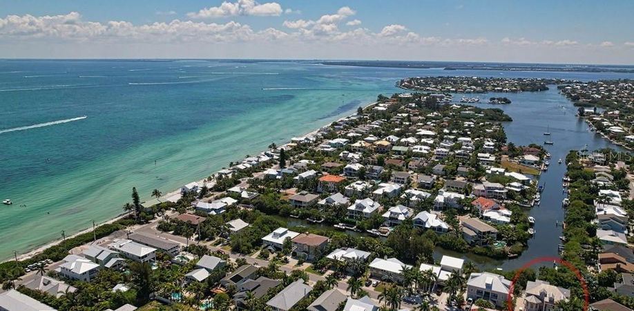 A WATERFRONT ISLAND HOME NEAR THE BEACH! This spacious custom home offers four en suite bedrooms, including two split level, primary suites and a bonus room or 5th bedroom. The lavish Key West inspired architecture boasts fabulous details including coffered, beamed, and board/batten ceilings, crown moldings, custom fixtures, stained glass, transom & clerestory windows, wainscotting, handcrafted built-ins, skilled wood craftsmanship, double and pocket doors, furniture quality cabinetry, solid surfaces, tile, and heart-pine hardwood floors throughout. The main level has an open layout with a built-in media center and fireplace that set the stage in the living room. The defined dining area combines the kitchen with the entertainment space. It has wood cabinetry, glass display shelving, vintage inspired tile tops and a matching mosaic backsplash, task lighting, and a detailed ceiling. A center island provides more storage and a breakfast bar. The stainless-steel appliances remain. Adjacent is a well-appointed laundry room with a built-in pantry. Two sets of French doors access the main level terrace overlooking the outdoor living space and water views. Entertain easily inside and out with stairs that cascade down to the ground floor paver-brick, open-air deck. Enjoy covered social areas, a sparkling pool and spa, an outdoor shower and a private, protected waterfront location with a dock and lift on the saltwater canal. The location swiftly flows into Tampa Bay and the Gulf of Mexico. Also at ground floor is the bonus room with a walk-in closet that can be used as a 5th bedroom. Plus, a 4-car garage with built-ins and an exercise room. The elevator ascends from this level all the way up to the second and third floors. The second, main level, has one of two primary bedroom suites with granite and a third en suite bed/bath. The catwalk landing on the top floor presents a fourth en suite bed/bath and the larger of the two primary suites. This Owner’s retreat boasts a wet bar, its own fireplace and terrace with bay views, plus a 16x09 California-style dressing room/closet. The private bathroom has a spa-like shower with multiple level shower heads. There is a lavatory and a bidet in the water closet. As well as dual pedestal sinks, a seated vanity and two separate cabinetry installations. Nestled nicely on the esteemed north end of Anna Maria Island, it features premier privacy with lush tropical landscaping; professionally tended with several varieties of palms, citrus trees, and fruit bearing producers. A mere two blocks from the AMI city pier and beach access.