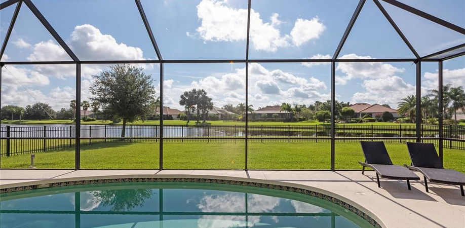 Check out this beautiful waterfront pool home with the open, great room layout that you have been looking to find. Located on a quiet cul de sac in the Country Meadows community, this is the popular Santa Maria layout built by Medallion Homes. Featuring 3 bedrooms, and a large bonus room that could easily be a 4th bedroom, office, or game room. The kitchen has a large breakfast bar, stainless steel appliances, cooktop, wall oven, wood cabinets, and granite countertops. Relax in the large master suite with dual walk-in closets and a master bathroom with dual vanities, garden tub, and walk-in shower. Entertain friends and family poolside on the expanded covered lanai with plenty of space to relax and enjoy the water views. Rarely available fenced back yard on the water is perfect for giving pets a safe place to play. Country Meadows is a perfect community to call home with low HOA fees, No CDD fees, excellent schools, and nearby shopping all in the fast-growing north Lakewood Ranch area. Make sure to check out the matterport virtual tour, and video for the home.