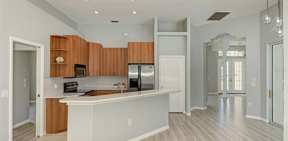 Move-In-Ready: This impressive 3 bed/2 bath POOL home has over 2000sqft and an oversized 2 car garage. As you arrive you are greeted by beautiful landscaping, a spacious front porch with double doors that open to this lovely updated home. Bright and spacious with HIGH ceilings, lots of natural light, sliding doors throughout, a formal dining room, a formal living room, a separate large family room, a breakfast nook, NEW water resistant laminate floors throughout, NEW lighting fixtures and fans throughout, hot water heater new in 2017, rescreened pool cage in 2021, and freshly painted inside and out in 2021. The kitchen overlooks the spacious family room and has gorgeous quartz counters, stainless steel appliances, and a pantry. Relax in the master suite that features tray ceilings and sliding doors leading out to the covered lanai, an on-suite bathroom with Jack and Jill vanities, a freestanding soaking tub, a double shower, and his and hers walk-in closets. The pool area is perfect for soaking up the Florida sun, swimming, or relaxing in the covered lanai! The backyard is fenced in and private with lots of mature landscape. This beautiful home is located a short drive to shopping, restaurants, and gorgeous Gulf Beaches.