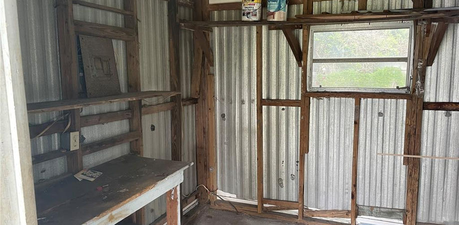 There a carport with an enclosed building and a shed in the backyard for extra storage. Home has a metal Roof.
